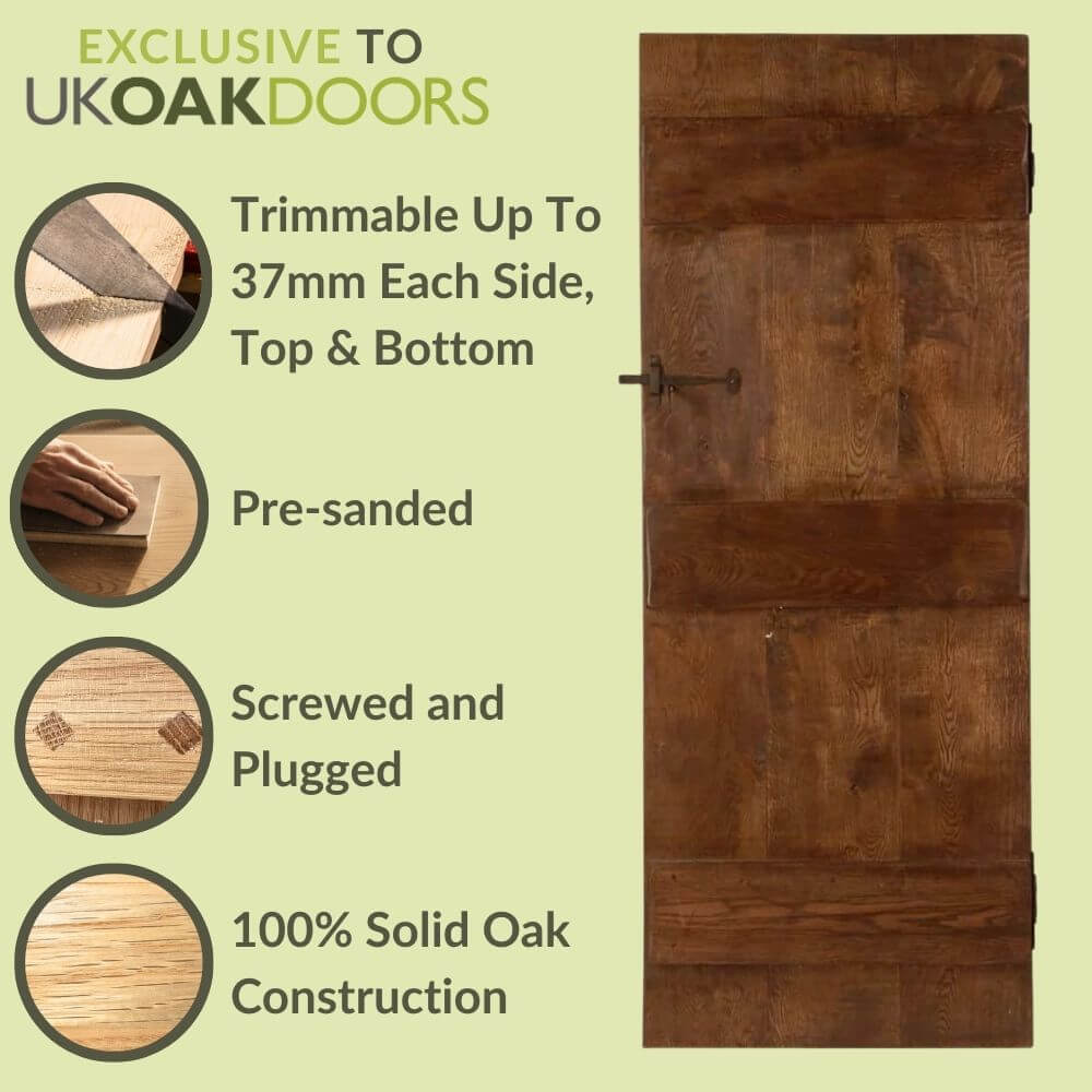 Crafted from PEFC Certified Character grade oak, the doors feature all the antique features you’d normally associate with the style. It’s handmade with large random-width vertical planks, 3 large horizontal ledges, tongue and groove construction, and a V-Groove profile to prevent warping of the door over time.