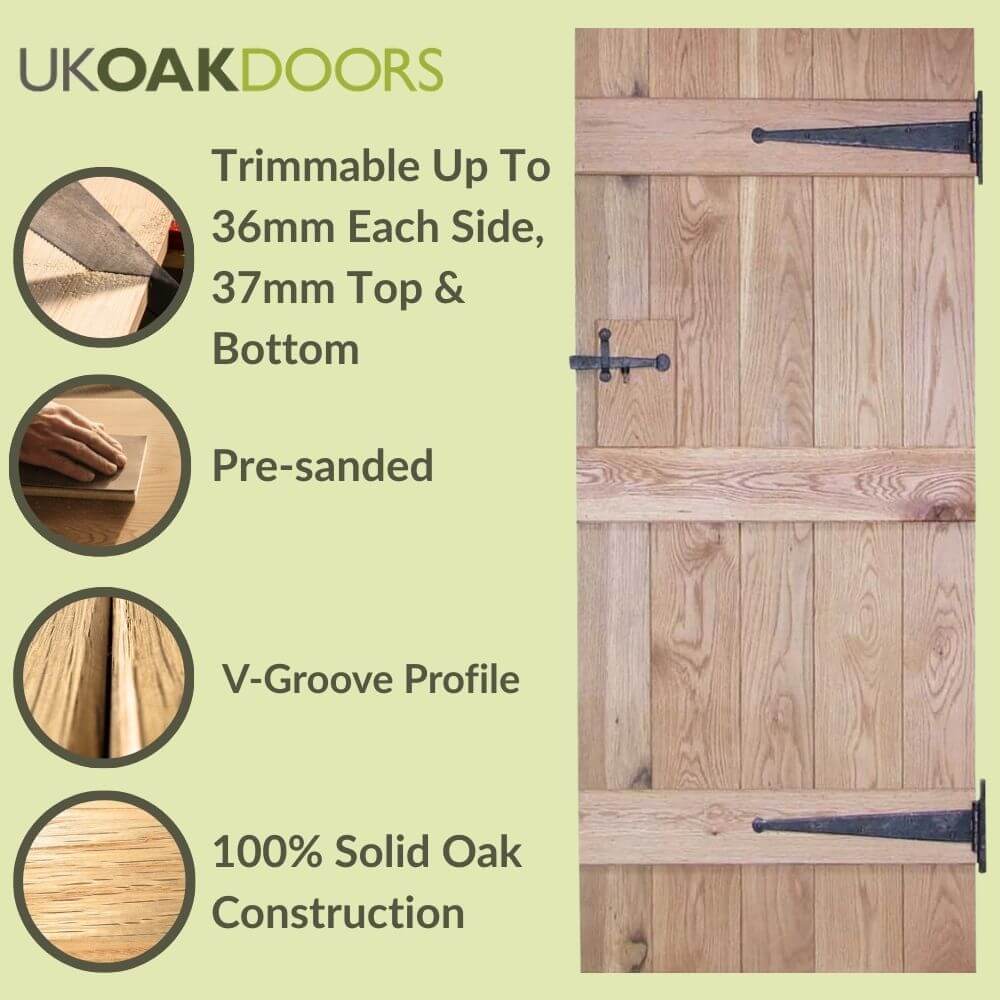 These doors are manufactured with specially kiln-dried rustic oak that has a low moisture content of 6-10%. The individual oak panels are finished in a V-Groove profile, and nail holes are also visible within this door (of course, you can fill these in if you’d prefer). The number of planks and the width of planks may vary from door to door, depending on measurements.